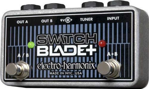 The Switchblade+ offers a convenient solution to a players switching needs. Route your signal to either output A or B, or send it to both at once. Connect a tuner or effects pedal to its dedicated Tuner output. With a fully passive audio path and active LED indication, the new Switchblade+ is your utilitarian sidekick. Controls A/B Footswitch (LED) Press this switch to route the input signal to either OUT A (Red LED) or OUT B (Green LED).A+B Footswitch (LED) Press this switch to route the input signal to both OUT A and OUT B. When A+B is engaged (Red LED), the A/B Footswitch has no effect on the signal path. I/O INPUT Connect the output of your instrument or another effects pedal to this jack.TUNER Connect this jack to the input of a tuner device or another effects pedal. This jack is hardwired to the INPUT jack and provides a direct output regardless of the state of the unit.OUT A Connect this jack to the input of an amplifier or the input of another effects pedal. Depending on the state of the A/B and A+B controls, this jack will output either the direct input signal or no signal. When the A/B LED is lit red or the A+B LED is lit up, OUT A is selected.OUT B Connect this jack to the input of an amplifier or the input of another effects pedal. Depending on the state of the A/B and A+B controls, this jack will output either the direct input signal or no signal. When the A/B LED is lit green or the A+B LED is lit up, OUT B is selected. Power -The SWITCHBLADE+ can be powered by a 9V battery or a 9VDC battery eliminator capable of delivering at least 16mA. The optional 9V power supply from Electro-Harmonix is 9.6DC-200BI (same as used by Boss & Ibanez) 9.6 Volts DC 200mA. The power supply must have a barrel connector with center negative.The SWITCHBLADE+ can also operate without power, since the audio path is fully passive. With no power, however, the LED indication will not function.When A+B is engaged, the input impedance at the INPUT jack is equal to 50k in paral